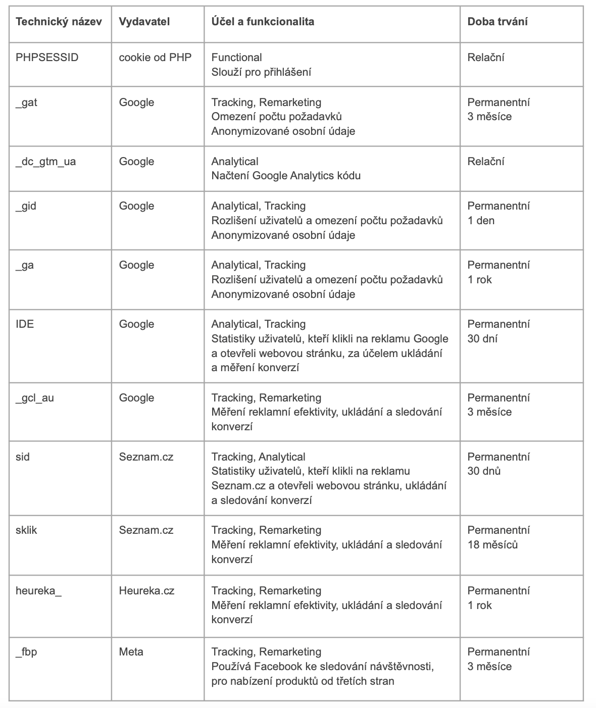 Další informace o cookies a jejich aktuální seznam naleznete prostřednictvím jednotlivých internetových prohlížečů, nejčastěji v položce Nástroje pro vývojáře.